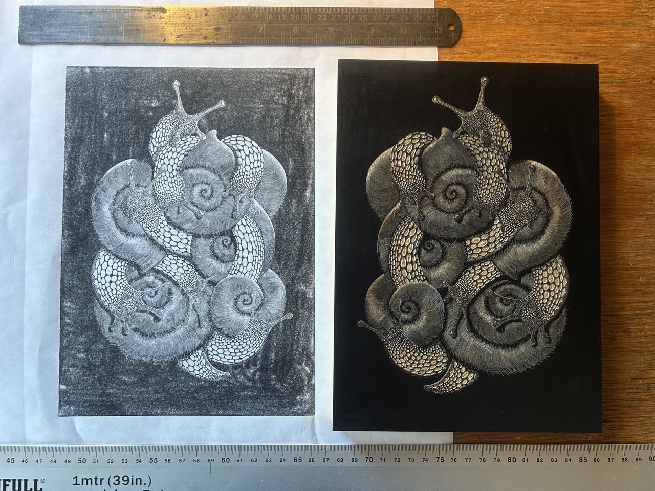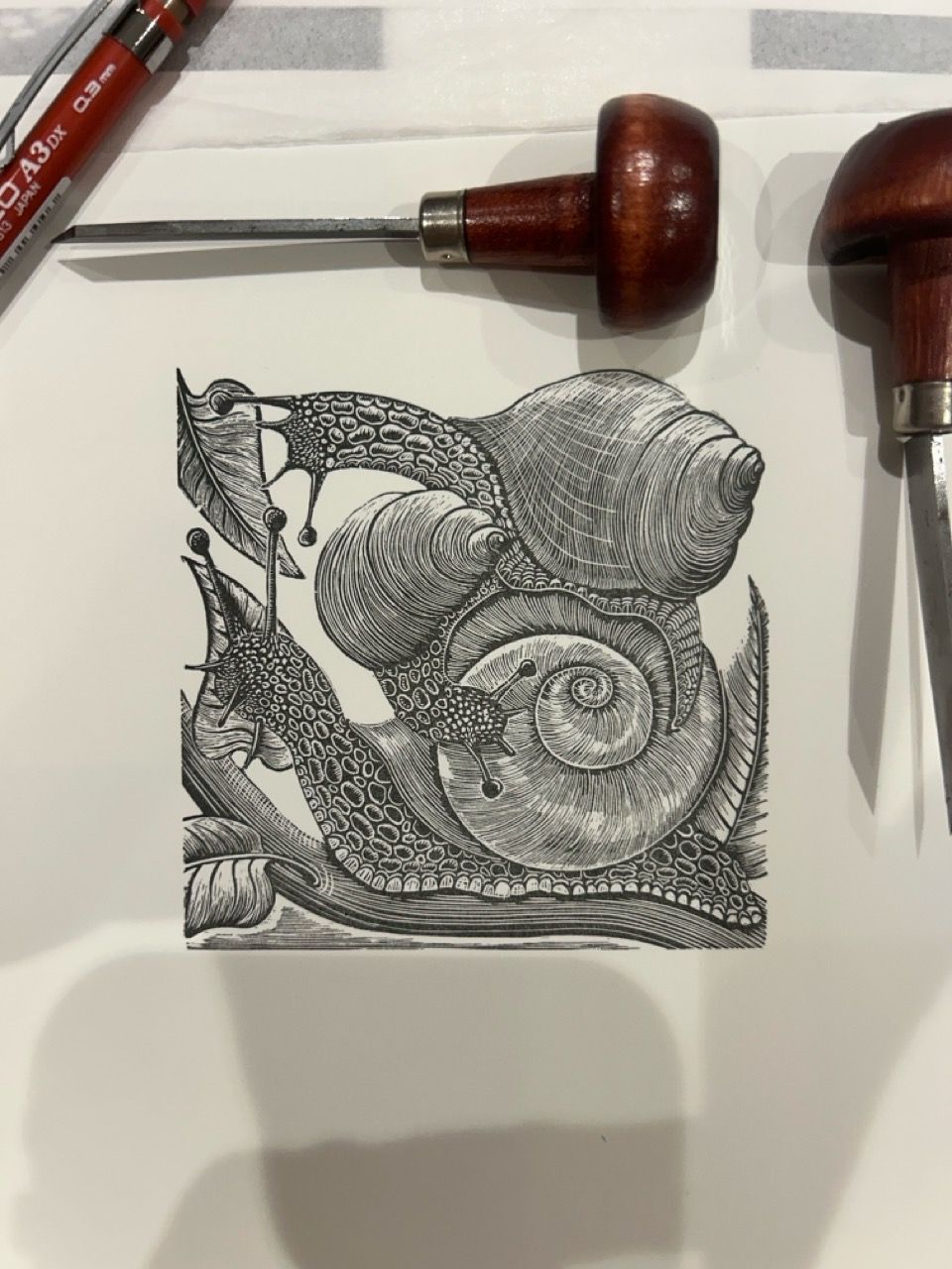 While her lino work is generally quite lighthearted, her wood engraving is beginning to explore human emotions, it’s intricacies and patterns, resulting in work that aims to illustrate some of the tangle of feelings we all experience.